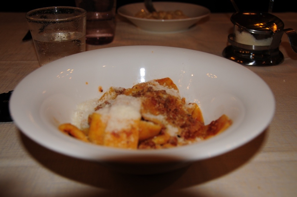 Owner chef cares about food. topini-gnocchi w/gorgonzola,L8000. secondo like salsicce e fagioli (sausage w/beans) L10,000.Cover L2000. Serves house wine in ceramic pitchers. Tues-Sun 12:30-2:30,7:30-10:30. LG. 05/21/95. Grace antipasto/penne w/tom. sauce/Pecorino. Joe tagliatelli Bolog./Salsicce e Fagioli. Salsicce e fagioli excellent. Service not great. Wine very good. Total bill for 2:L58000