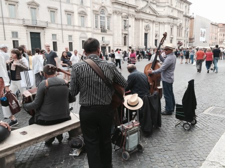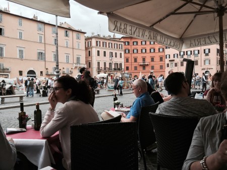May 17, 2015We arrived in Roma yesterday, met up with Bill and Sandy who flew in from NY and spent a nice day exploring piazzas and drinking vino. We wrapped up the day with a nice dinner at Otello. The first day is always tough after a sleepless night on the plane. We always try to stay awake to avoid jet lag.